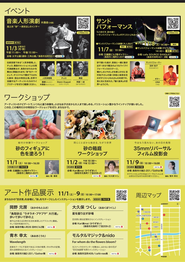 11月1日(土)~9日(日)に、鳥取市中心市街地内の公共空間や空き物件等を舞台に、『まちあるき×砂アート ‐大人も子どもも、観光客も地元住民も楽しめるアートなまちなか体験‐』をコンセプトとした実証事業を行います。