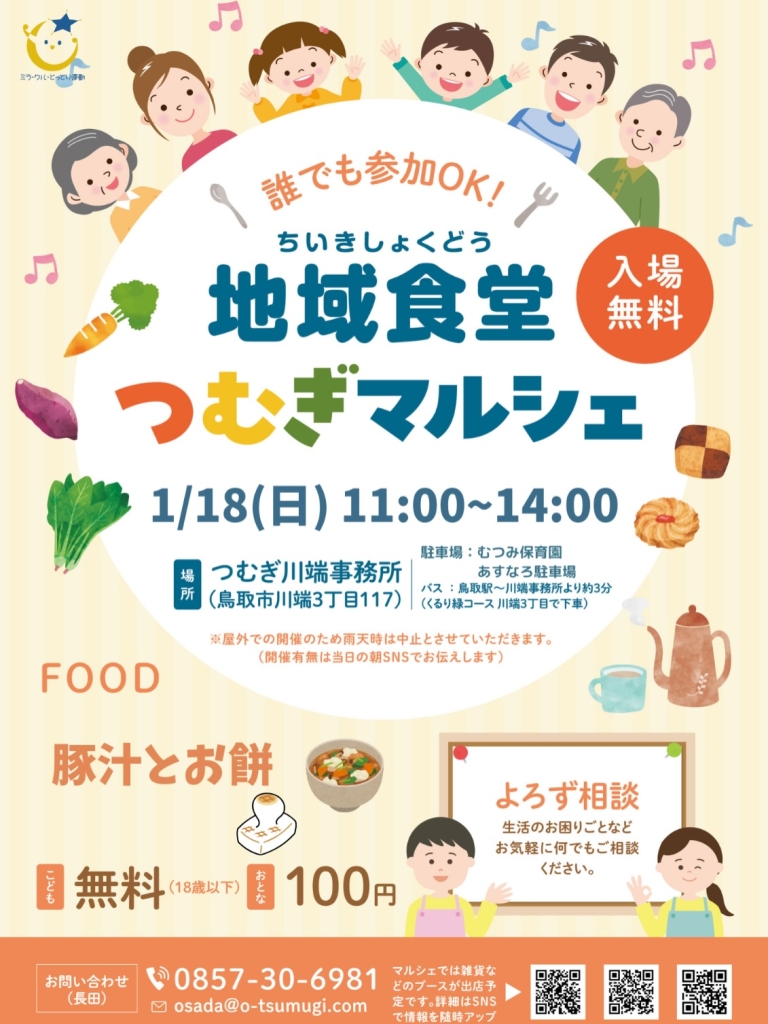 まちなかイベントスケジュール2026年1月 まちなかイベント 2026.01.05 『とっとりの藩と城 歴史・自然史・美術工芸【第4期】』 開催期間:開催中~2026年1月4日(日) 開催場所&主催者:鳥取県立博物館 『馬アートフェスタ展』 開催期間:開催中~2026年1月15日(木) 開催場所:鳥取市移住・交流情報ガーデン 主催者:認定NPO法人 ハーモニィカレッジ 『うまのおもちゃであそぼう パッパカ パーク』 開催期間:開催中~2026年1月12日(月) 開催場所&主催者:わらべ館 『MINORUTOUKI BRANCH STORE』 開催期間:開催中~2026年1月12日(月) 開催場所&主催者:丸由百貨店 『日本のやきもの』 開催期間:開催中~2026年5月10日(日) 開催場所:鳥取民藝美術館 主催者:(公財)鳥取民藝美術館 『吉田璋也の新作民藝』 開催期間:開催中~2026年5月10日(日) 開催場所:鳥取民藝美術館 主催:(公財)鳥取民藝美術館 『冬の断捨離展』 開催期間:1月3日(土)~2月1日(日) 開催場所:ブランワークス 『niwacoの庭づくり 畑の土づくりWS』 開催期間:1月4日(日) 開催場所:旧横田医院 主催者:ホスピテイル・プロジェクト実行委員会 『メリーゴーランドがやってくる!』 開催期間:1月5日(月)~12日(月) 開催場所&主催者:わらべ館 『岡野元房の世界 2026 ANGEL & RAORAO LINK』 開催期間:1月8日(木)~13日(火) 開催場所:ギャラリーそら 『ぼくのわたしのとっとりはりこ2』 開催期間:1月8日(木)~13日(火) 開催場所:ギャラリーそら 『Huu.の受注会』 開催期間:1月8日(木)~31日(土) 開催場所:gallery shop SORA 『歴史講座「鳥取藩の鉄山政策史」』 開催期間:1月10日(土) 開催場所:鳥取県立博物館 主催者:鳥取県立博物館、鳥取地域史研究会 『第23回鳥取県ジュニア美術展覧会-東部展示』 開催期間:1月10日(土)~18日(日) 開催場所:鳥取県立博物館 主催者:鳥取県、鳥取県教育委員会 『歌噺(うたばなし)歌と落語で聴く人情物語』 開催期間:1月11日(日) 開催場所:パレットとっとり市民交流ホール 主催者:Dagny Music 『民族講座「昔の子どもの遊びをしよう!」』 開催期間:1月11日(日) 開催場所&主催者:鳥取県立博物館 『とっとりの藩と城 歴史・自然史・美術工芸【第5期】』 開催期間:1月14日(水)~3月8日(日) 開催場所&主催者:鳥取県立博物館 『人形操演の奥深き世界』 ※定員に達しました 開催期間:1月17日(土) 開催場所&主催者:わらべ館 『パレット冬あそび』 開催期間:1月17日(土)・18日(日) 開催場所:パレットとっとり市民交流ホール 主催者:鳥取商工会議所 『つむぎマルシェ×地域食堂』 開催期間:1月18日(日) 開催場所:鳥取市川端3丁目117 主催者:株式会社つむぎ 『すみおれ図書館 開館日』 開催期間:1月18日(日) 開催場所:旧横田医院 主催者:ホスピテイル・プロジェクト実行委員会 『バレンタイン&スイーツフェア』 開催期間:1月21日(水)~2月15日(日) 開催場所&主催者:丸由百貨店 『令和7年度あいサポート・アートとっとり展』 開催期間:1月23日(金)~2月1日(日) 開催場所:鳥取県立博物館 主催者:鳥取県(障がい福祉課) 『移住者交流会「英語にふれよう!」』 開催期間:1月24日(土) 開催場所&主催者:鳥取市移住・交流情報ガーデン 『歴史講座「名和一族の歴史―鎌倉時代から近代までー」』 開催期間:1月25日(日) 開催場所&主催者:鳥取県立博物館 ※イベントは、中止や延期、内容等の変更が行われることもありますので、ご了承ください。 関連記事 まちなかイベントスケジュール2026年2月 ※イベントは、中止や延期、内容等の変更が行われることもありますので、ご了承ください。 2026.01.27 まちなかイベントスケジュール2025年12月 ※イベントは、中止や延期、内容等の変更が行われることもありますので、ご了承ください。 2025.11.27 まちなかイベントスケジュール2025年11月 ※イベントは、中止や延期、内容等の変更が行われることもありますので、ご了承ください。 2025.10.27