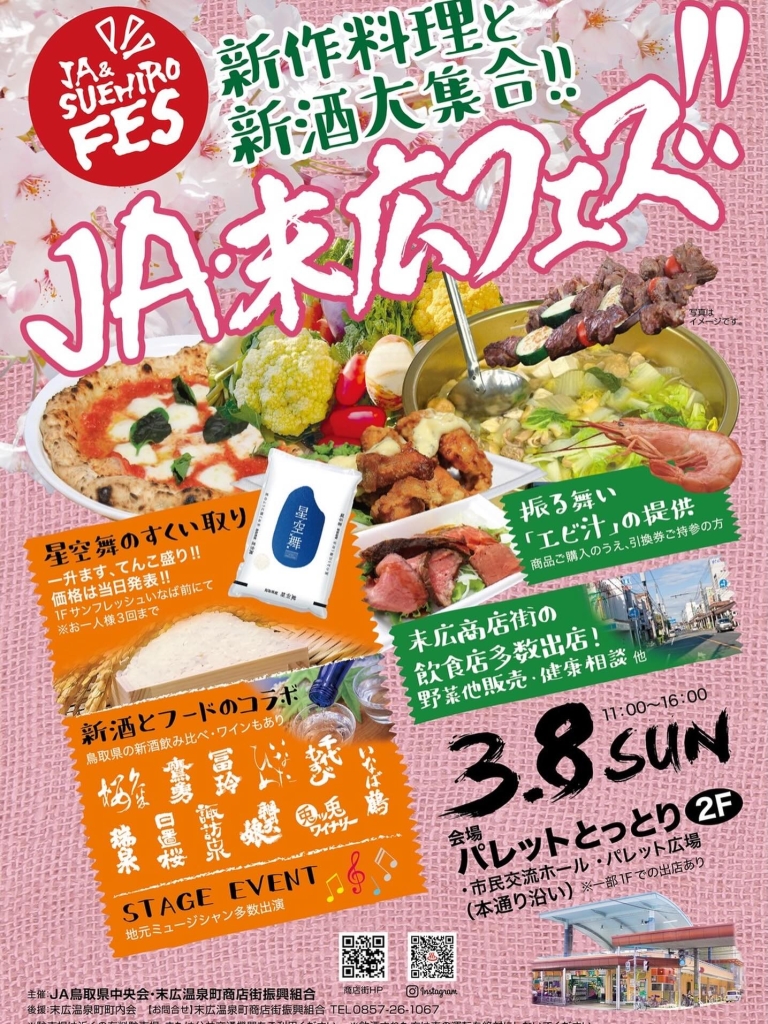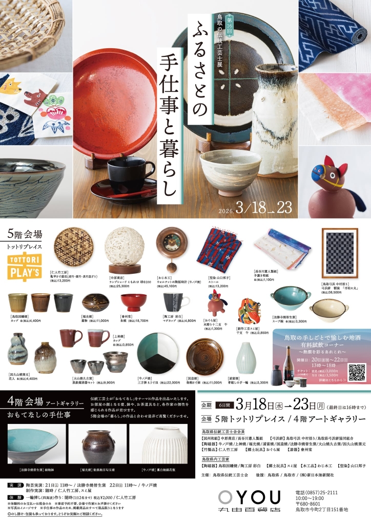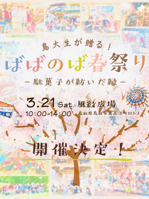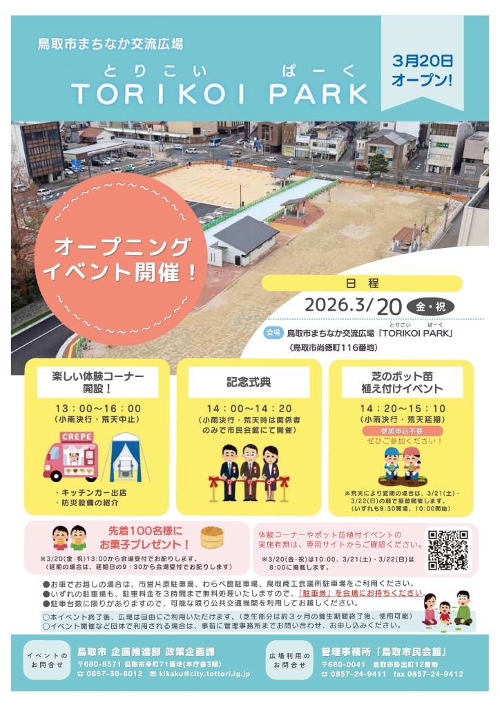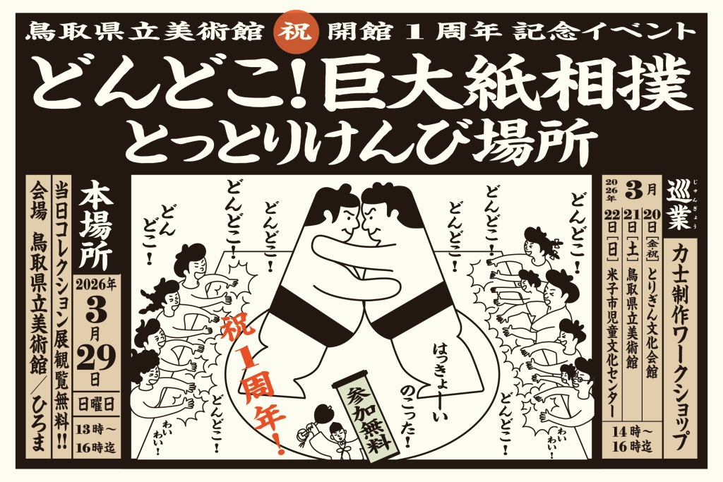 まちなかイベントスケジュール2026年3月 まちなかイベント 2026.02.27 『OYOU ねこフェス 2026』 開催期間:開催中~3月2日(月) 開催場所&主催者:丸由百貨店 『とっとりの藩と城 歴史・自然史・美術工芸【第5期】』 開催期間:開催中~3月8日(日) 開催場所&主催者:鳥取県立博物館 『鞄展』 開催期間:開催中~3月31日(火) 開催場所:gallery shop SORA 『令和7年度収蔵資料展』 開催期間:開催中~4月12日(日) 開催場所&主催者:わらべ館 『日本のやきもの』 開催期間:開催中~5月10日(日) 開催場所:鳥取民藝美術館 主催者:(公財)鳥取民藝美術館 『吉田璋也の新作民藝』 開催期間:開催中~5月10日(日) 開催場所:鳥取民藝美術館 主催:(公財)鳥取民藝美術館 『池本喜己オリジナル写真展』 開催期間:2月26日(木)~3月3日(火) 開催場所:ギャラリーそら 『江戸絵画から《ブリロ・ボックス》まで』 開催期間:2月28日(土)~3月22日(日) 開催場所:鳥取県立博物館 主催者:鳥取県立美術館 『春のグルメフェア』 開催期間:3月4日(水)~9日(月) 開催場所&主催者:丸由百貨店 『JA・末広フェス』 開催期間:3月8日(日) 開催場所:パレットとっとり2F 主催者:JA鳥取県中央会、末広温泉町商店街振興組合 『将棋ひろば』 開催期間:3月8日(日) 開催場所&主催者:わらべ館 『人形劇団あっけらかん「だるまちゃんとてんぐちゃん」』 開催期間:3月8日(日) 開催場所:とりぎん文化会館 小ホール 主催者:鳥取おやこ劇場 『乳幼児紙芝居 おはなしピクニック』 開催期間:3月13日(金)・4月10日(金) 開催場所&主催者:わらべ館 『ウルトラハレハレケケケ市場』 開催期間:3月14日(土) 開催場所:駅前太平線バード・ハット 『歴史講座「古代因幡道を推定する」』 開催期間:3月14日(土) 開催場所:鳥取県立博物館 会議室 主催者:鳥取県立博物館、鳥取地域史研究会 『ギャラリーコンサート特別編 ファミリーコンサート』 開催期間:3月15日(日) 開催場所:とりぎん文化会館 大ホール 主催者:(一財)鳥取市教育福祉振興会 『第51回鳥取県立鳥取西高等学校吹奏楽部定期演奏会』 開催期間:3月15日(日) 開催場所:とりぎん文化会館 梨花ホール 主催者:鳥取西高等学校 『歴史講座「とっとり藩の古文書を読む」』 開催期間:3月15日(日) 開催場所:鳥取県立博物館 会議室 主催者:鳥取県立博物館 『鳥取の伝統工芸士展 ふるさとの手仕事と暮らし』 開催期間:3月18日(水)~23日(月) 開催場所&主催者:丸由百貨店 『とっとりの藩と城 歴史・自然史・美術工芸【第6期】』 開催期間:3月18日(水)~5月10日(日) 開催場所&主催者:鳥取県立博物館 『鳥取市まちなか交流広場「TORIKOI PARK(とりこい ぱーく)」 オープニングイベント』 開催期間:3月20日(金祝) 開催場所:TORIKOI PARK 主催者:鳥取市 『どんどこ!巨大紙相撲 力士制作ワークショップ』 開催期間:3月20日(金祝) 開催場所:とりぎん文化会館 リハーサル室 主催者:鳥取県立美術館 『わらべ音楽タイム』 開催期間:3月20日(金祝) 開催場所&主催者:わらべ館 『鳥大生が贈る! ばばのば春祭り ~駄菓子が紡いだ縁~』 開催期間:3月21日(土) 開催場所:風紋広場 主催者:ばばのばプロジェクト 『おととからだであそぼう!』 開催期間:3月21日(土) 開催場所&主催者:わらべ館 『映画「飯館村べこやの母ちゃん―それぞれの選択」上映会』 開催期間:3月22日(日) 開催場所:鳥取県立博物館 講堂 主催者:シネマふねえとる 『moon birdのおとなもこどももゆったりコンサート』 開催期間:3月22日(日) 開催場所&主催者:わらべ館 『桜ヶ丘中学校メーカーズプロジェクト作品展』 開催期間:3月23日(月)~31日(火) 開催場所&主催者:わらべ館 『おさなごのわらべうたあそび』 開催期間:3月25日(水) 開催場所&主催者:わらべ館 『かたちで遊ぼう~やわらか3Dプリントで模様を動かす~』 開催期間:3月26日(木)・27日(金) 開催場所&主催者:わらべ館 『わらべ館 カラオケ大会』 開催期間:3月28日(土) 開催場所&主催者:わらべ館 『風紋マーケット×ルルマルシェ』 開催期間:3月28日(土) 開催場所:風紋広場 主催者:風紋広場事務局 『ちびっこあつまれ!「とっとり鉄道おもちゃ広場」』 開催期間:3月29日(日) 開催場所:鳥取市民交流センター(麒麟Square) 『智頭の木で楽しむプレートづくり』 開催期間:3月30日(月)・31日(火) 開催場所&主催者:わらべ館 ※イベントは、中止や延期、内容等の変更が行われることもありますので、ご了承ください。 関連記事 まちなかイベントスケジュール2026年2月 ※イベントは、中止や延期、内容等の変更が行われることもありますので、ご了承ください。 2026.01.27 まちなかイベントスケジュール2026年1月 ※イベントは、中止や延期、内容等の変更が行われることもありますので、ご了承ください。 2026.01.05 まちなかイベントスケジュール2025年12月 ※イベントは、中止や延期、内容等の変更が行われることもありますので、ご了承ください。 2025.11.27