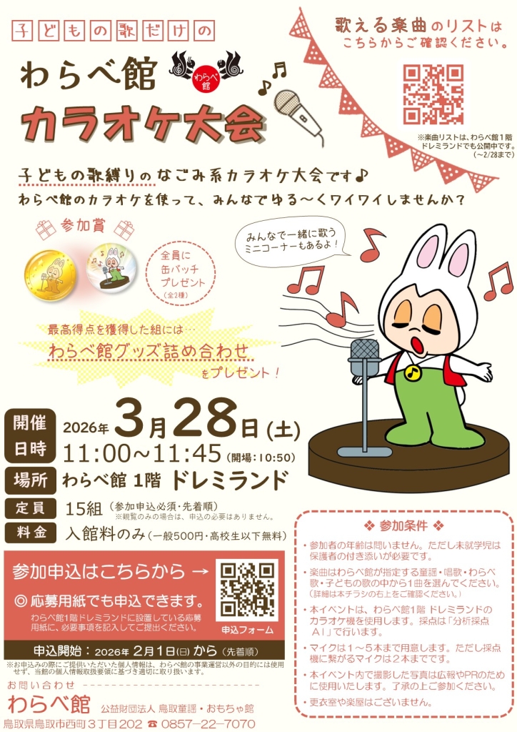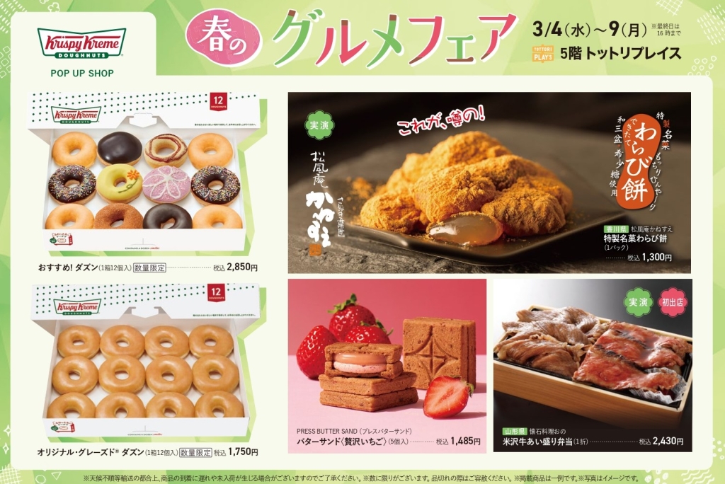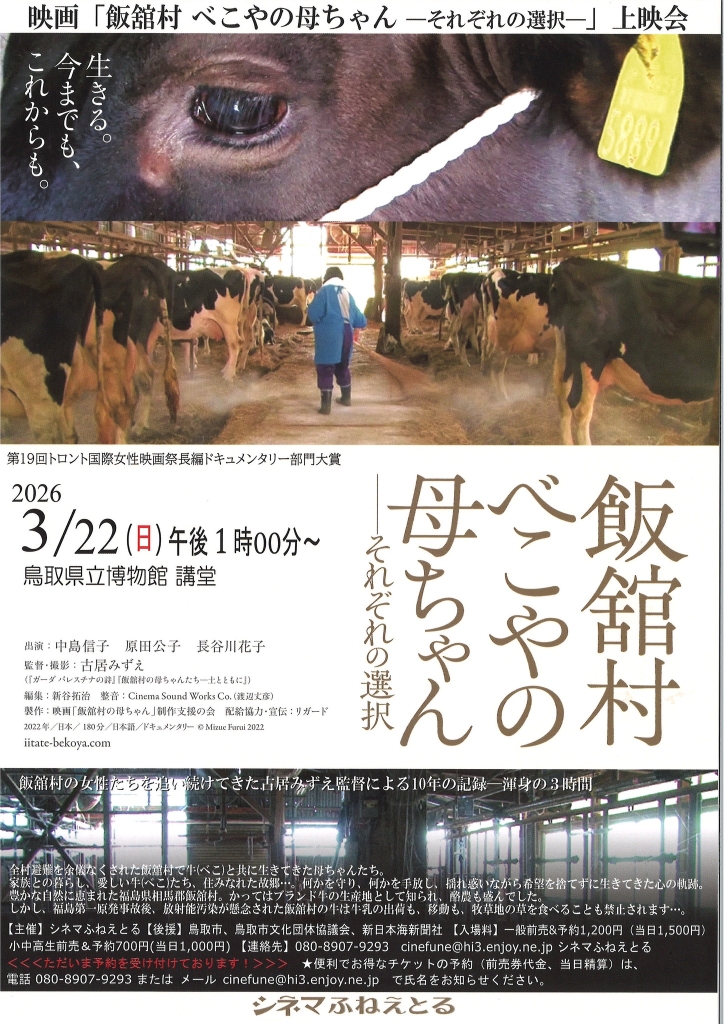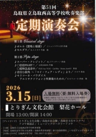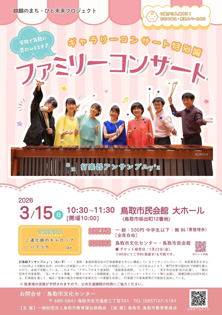 まちなかイベントスケジュール2026年3月 まちなかイベント 2026.02.27 『OYOU ねこフェス 2026』 開催期間:開催中~3月2日(月) 開催場所&主催者:丸由百貨店 『とっとりの藩と城 歴史・自然史・美術工芸【第5期】』 開催期間:開催中~3月8日(日) 開催場所&主催者:鳥取県立博物館 『鞄展』 開催期間:開催中~3月31日(火) 開催場所:gallery shop SORA 『令和7年度収蔵資料展』 開催期間:開催中~4月12日(日) 開催場所&主催者:わらべ館 『日本のやきもの』 開催期間:開催中~5月10日(日) 開催場所:鳥取民藝美術館 主催者:(公財)鳥取民藝美術館 『吉田璋也の新作民藝』 開催期間:開催中~5月10日(日) 開催場所:鳥取民藝美術館 主催:(公財)鳥取民藝美術館 『池本喜己オリジナル写真展』 開催期間:2月26日(木)~3月3日(火) 開催場所:ギャラリーそら 『江戸絵画から《ブリロ・ボックス》まで』 開催期間:2月28日(土)~3月22日(日) 開催場所:鳥取県立博物館 主催者:鳥取県立美術館 『春のグルメフェア』 開催期間:3月4日(水)~9日(月) 開催場所&主催者:丸由百貨店 『JA・末広フェス』 開催期間:3月8日(日) 開催場所:パレットとっとり2F 主催者:JA鳥取県中央会、末広温泉町商店街振興組合 『将棋ひろば』 開催期間:3月8日(日) 開催場所&主催者:わらべ館 『人形劇団あっけらかん「だるまちゃんとてんぐちゃん」』 開催期間:3月8日(日) 開催場所:とりぎん文化会館 小ホール 主催者:鳥取おやこ劇場 『乳幼児紙芝居 おはなしピクニック』 開催期間:3月13日(金)・4月10日(金) 開催場所&主催者:わらべ館 『ウルトラハレハレケケケ市場』 開催期間:3月14日(土) 開催場所:駅前太平線バード・ハット 『歴史講座「古代因幡道を推定する」』 開催期間:3月14日(土) 開催場所:鳥取県立博物館 会議室 主催者:鳥取県立博物館、鳥取地域史研究会 『ギャラリーコンサート特別編 ファミリーコンサート』 開催期間:3月15日(日) 開催場所:とりぎん文化会館 大ホール 主催者:(一財)鳥取市教育福祉振興会 『第51回鳥取県立鳥取西高等学校吹奏楽部定期演奏会』 開催期間:3月15日(日) 開催場所:とりぎん文化会館 梨花ホール 主催者:鳥取西高等学校 『歴史講座「とっとり藩の古文書を読む」』 開催期間:3月15日(日) 開催場所:鳥取県立博物館 会議室 主催者:鳥取県立博物館 『鳥取の伝統工芸士展 ふるさとの手仕事と暮らし』 開催期間:3月18日(水)~23日(月) 開催場所&主催者:丸由百貨店 『とっとりの藩と城 歴史・自然史・美術工芸【第6期】』 開催期間:3月18日(水)~5月10日(日) 開催場所&主催者:鳥取県立博物館 『鳥取市まちなか交流広場「TORIKOI PARK(とりこい ぱーく)」 オープニングイベント』 開催期間:3月20日(金祝) 開催場所:TORIKOI PARK 主催者:鳥取市 『どんどこ!巨大紙相撲 力士制作ワークショップ』 開催期間:3月20日(金祝) 開催場所:とりぎん文化会館 リハーサル室 主催者:鳥取県立美術館 『わらべ音楽タイム』 開催期間:3月20日(金祝) 開催場所&主催者:わらべ館 『鳥大生が贈る! ばばのば春祭り ~駄菓子が紡いだ縁~』 開催期間:3月21日(土) 開催場所:風紋広場 主催者:ばばのばプロジェクト 『おととからだであそぼう!』 開催期間:3月21日(土) 開催場所&主催者:わらべ館 『映画「飯館村べこやの母ちゃん―それぞれの選択」上映会』 開催期間:3月22日(日) 開催場所:鳥取県立博物館 講堂 主催者:シネマふねえとる 『moon birdのおとなもこどももゆったりコンサート』 開催期間:3月22日(日) 開催場所&主催者:わらべ館 『桜ヶ丘中学校メーカーズプロジェクト作品展』 開催期間:3月23日(月)~31日(火) 開催場所&主催者:わらべ館 『おさなごのわらべうたあそび』 開催期間:3月25日(水) 開催場所&主催者:わらべ館 『かたちで遊ぼう~やわらか3Dプリントで模様を動かす~』 開催期間:3月26日(木)・27日(金) 開催場所&主催者:わらべ館 『わらべ館 カラオケ大会』 開催期間:3月28日(土) 開催場所&主催者:わらべ館 『風紋マーケット×ルルマルシェ』 開催期間:3月28日(土) 開催場所:風紋広場 主催者:風紋広場事務局 『ちびっこあつまれ!「とっとり鉄道おもちゃ広場」』 開催期間:3月29日(日) 開催場所:鳥取市民交流センター(麒麟Square) 『智頭の木で楽しむプレートづくり』 開催期間:3月30日(月)・31日(火) 開催場所&主催者:わらべ館 ※イベントは、中止や延期、内容等の変更が行われることもありますので、ご了承ください。 関連記事 まちなかイベントスケジュール2026年2月 ※イベントは、中止や延期、内容等の変更が行われることもありますので、ご了承ください。 2026.01.27 まちなかイベントスケジュール2026年1月 ※イベントは、中止や延期、内容等の変更が行われることもありますので、ご了承ください。 2026.01.05 まちなかイベントスケジュール2025年12月 ※イベントは、中止や延期、内容等の変更が行われることもありますので、ご了承ください。 2025.11.27