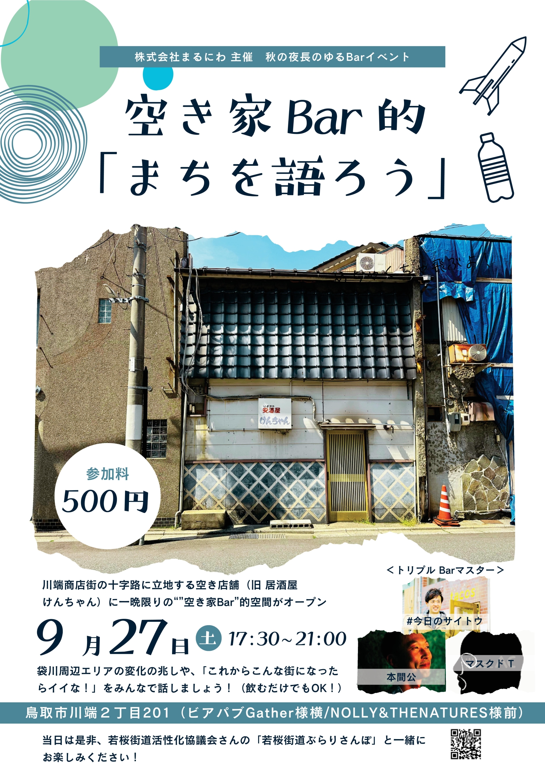 川端商店街の十字路に立地する空き店舗(旧 居酒屋けんちゃん)に一晩限りの”空き家Bar”的空間がオープン!袋川周辺エリアの変化の兆しや、「これからこんな街になったらイイな!」をみんなで話しましょう!(飲むだけでもOK!)